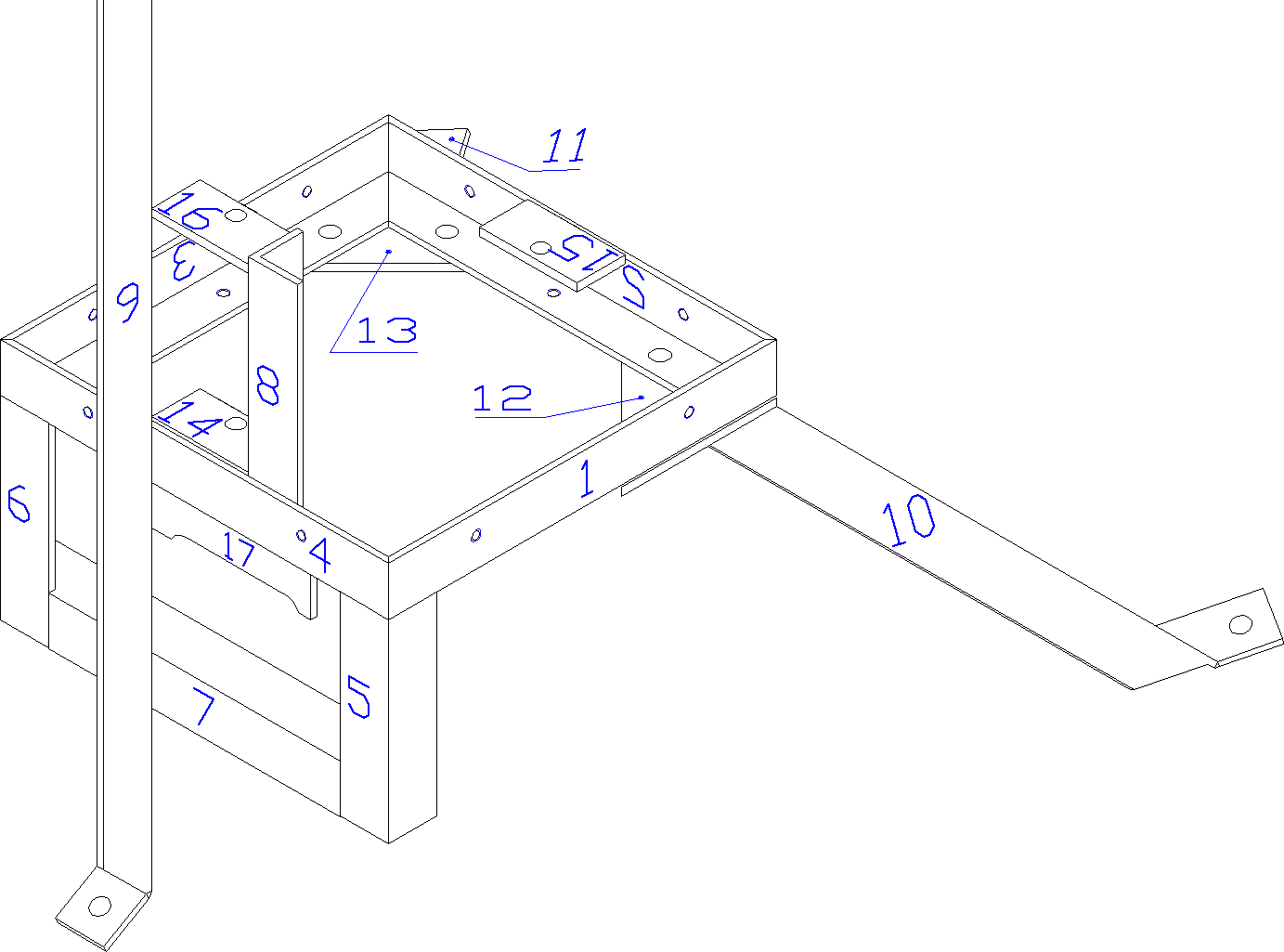 Drilling the holes in the square can best be done after it is welded together. The size and location of holes on the flat side correspond with those of the separation sheet in fig. 4.13, so clamp this on and mark where the holes should come. The proper location of the holes in upright sides can be derived from the holes at the flat side, or could be measured out. For an easy fixing of separation disk, side cover and shield, the frame is designed with holes with M5 thread in it. Then these holes must be drilled with 4.2 mm and an M5 thread tapped into them. However, using bolts and nuts would be just as good, in which case the holes should be 5 mm.